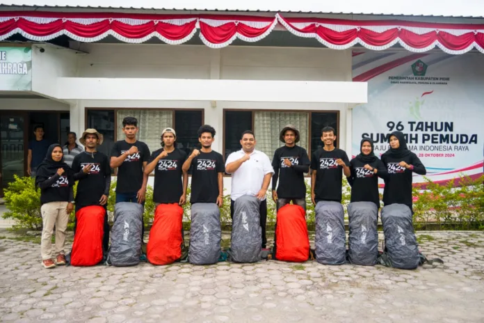 Sigli – Kepala Dinas Pariwisata, Ekonomi Kreatif, Kepemudaan dan Olahraga (Disparekrafpora) Kabupaten Pidie, Edy Saputra S.IP, MM, melepas tim Ekspedisi Merah Putih Sumpah Pemuda 2025, menuju puncak Gunung Apui Peut Sagoe, Kecamatan Geumpang, Pidie, Rabu (15/10).